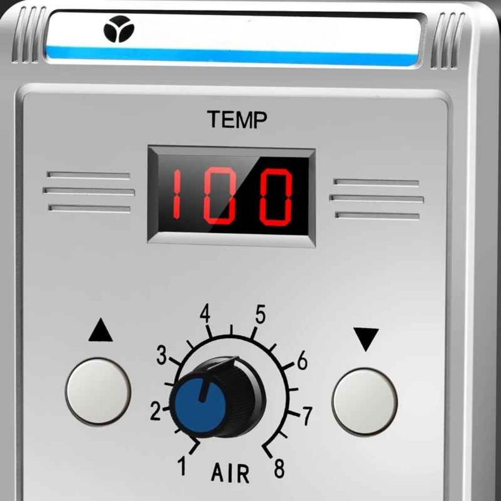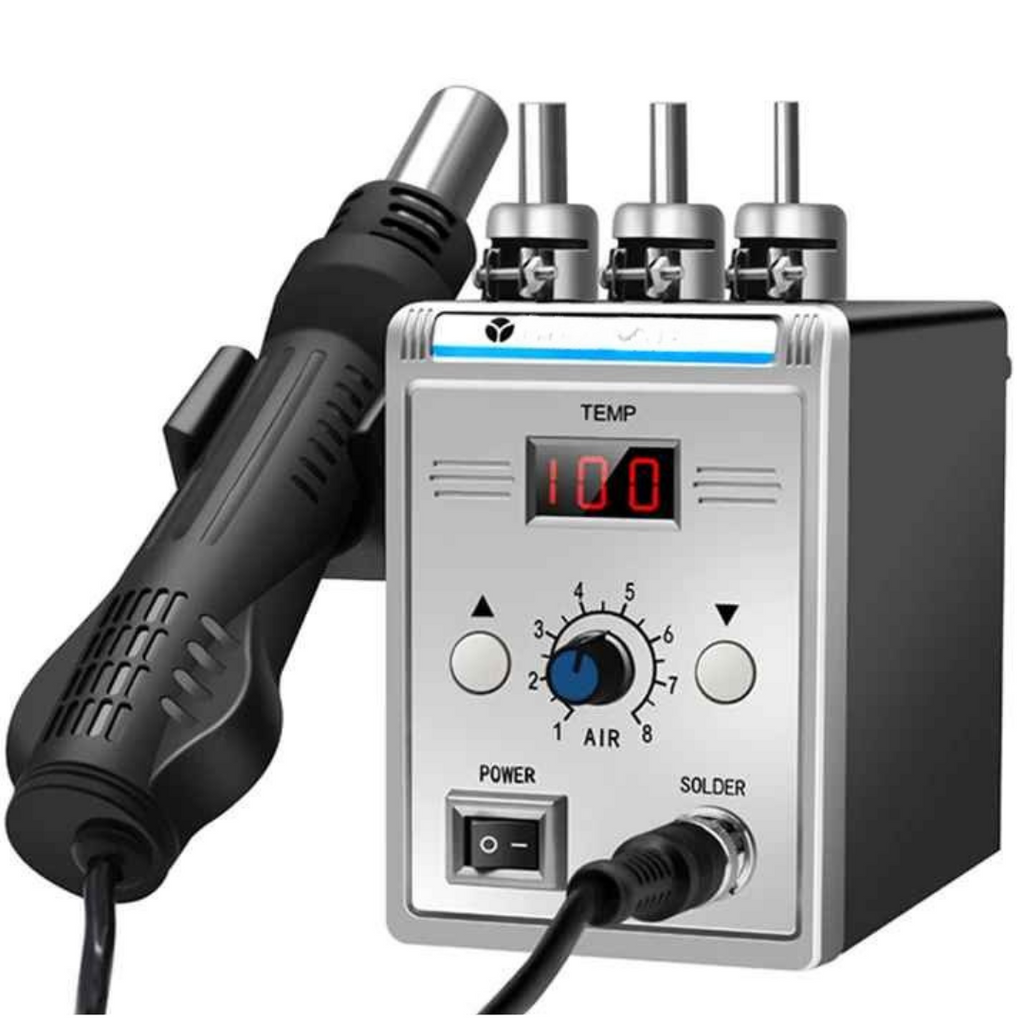 Equipada com um display digital, essa estação permite o ajuste preciso da temperatura, garantindo uma soldagem uniforme e protegendo os componentes contra superaquecimento. A pistola de ar quente também conta com controle de fluxo, facilitando a remoção de solda e reparo de placas eletrônicas.